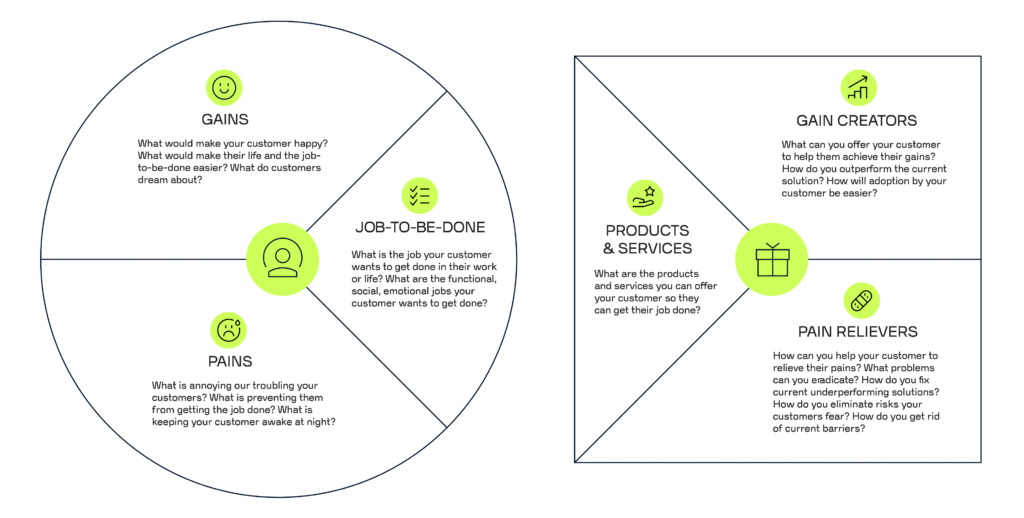 The value proposition canvas is another great tool to make sure your solution aligns with real needs. Start with the customer side (your target group) – you’ll complete the solution side later during solution design.